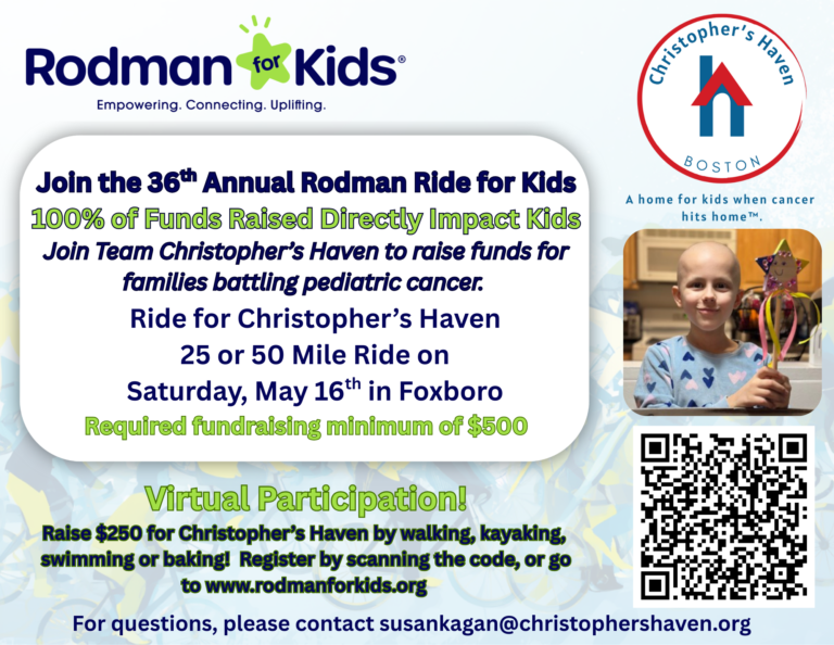 Christopher's Haven is participating in the 2026 Rodman Ride for Kids. Join our team to ride 25 miles or 50 miles and all funds raised go to support our families fighting pediatric cancer. You can also participate virtually! Raise $250 and receive a Christopher's Haven embroidered hat.