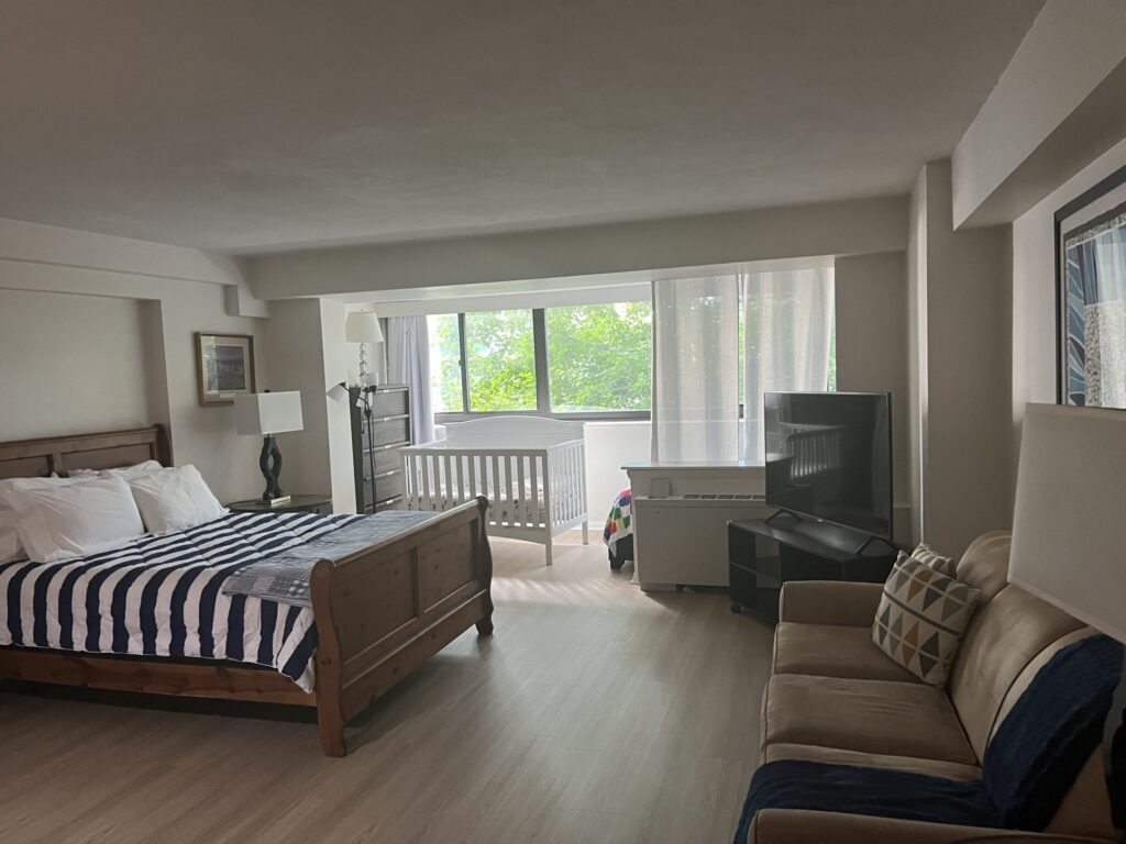 Each apartment is fully furnished with a queen, twin, and pullout bed as well as a smart television and Wi-Fi. There is a fully equipped kitchen with a full-sized refrigerator, stove, dishwasher, coffee maker, toaster, dishes, pots, pans, and utensils. Each apartment has a full bathroom. The apartments are furnished with blankets/linens and towels.